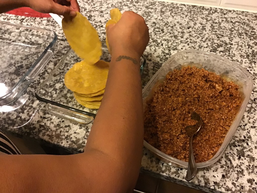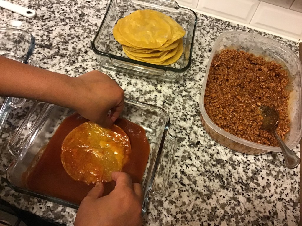 The next step was simply picking the enchilada sauce. This may seem like a small step, but let me assure you the sauce is everything. She uses Gebhardt’s ranchero sauce. Let me be the first to let you all know, it is the best enchilada sauce on the planet.